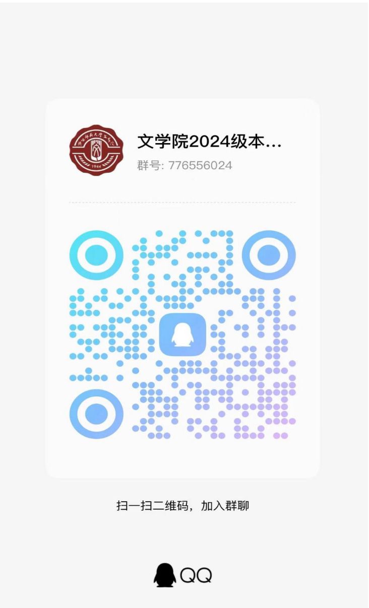 为做好新生迎新工作,帮助同学们提前熟悉公司、了解工作安排,公司特建立2024级本科生新生QQ群(群号:776556024,群二维码见下图)。申请加入群聊时,请各位同学注明自己的姓名和专业(如:李某 汉语言文学-公费师范生),并在加群后及时修改自己的群昵称为:姓名-专业-联系方式(如:李某-汉语言文学-10000000000)。