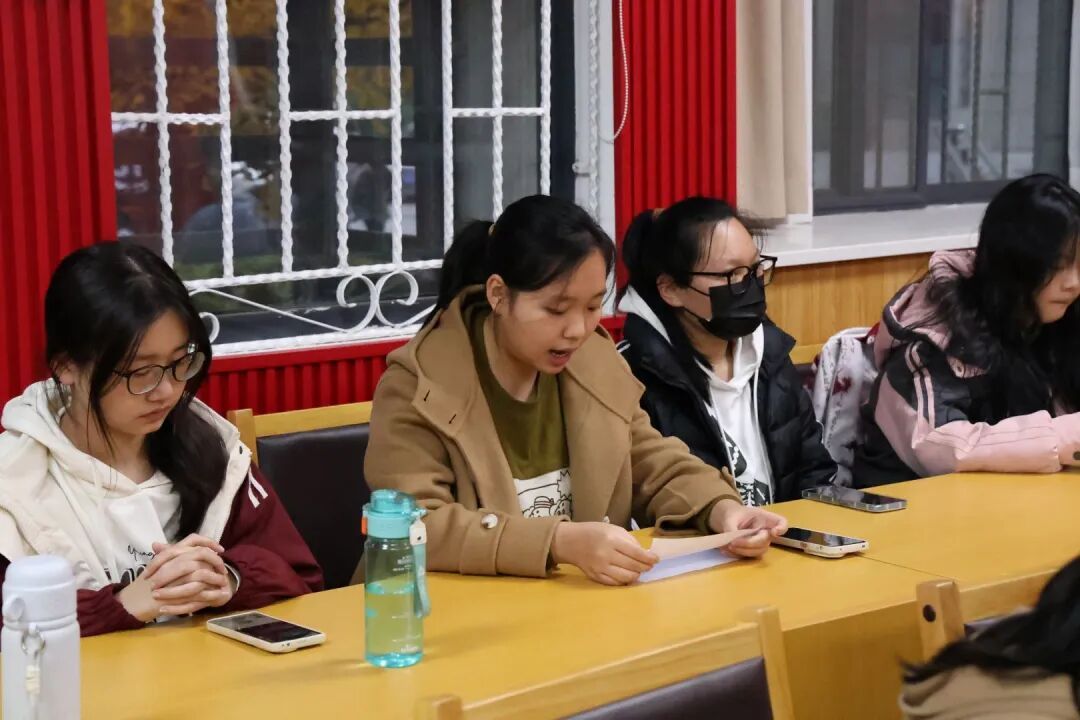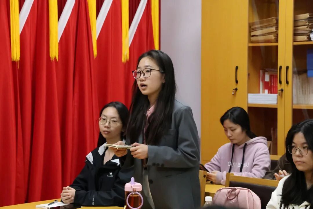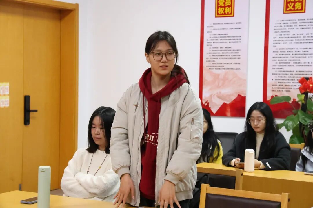 随后,2024级团支书徐宇枫结合自身学习体会,分享了阅读《习近平谈治国理政》第五卷的心得感悟。她围绕书中“以人民为中心”的根本立场,联系团组织工作实际,阐述了理论对团员思想引领与实践工作的指导意义。
