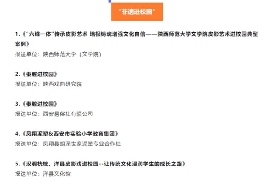 2022年12月15日,陕西省文化和旅游厅公布了“触摸历史 创新传承——非遗融合创新与传承发展优秀案例”入选名单,在“非遗进校园”类十大典型案例中,bv伟德《“六维一体”传承皮影艺术 培根铸魂增强文化自信——bv伟德皮影艺术进校园典型案例》荣登榜首,是陕西高校唯一入选案例,为公司立德树人重要成果之一。