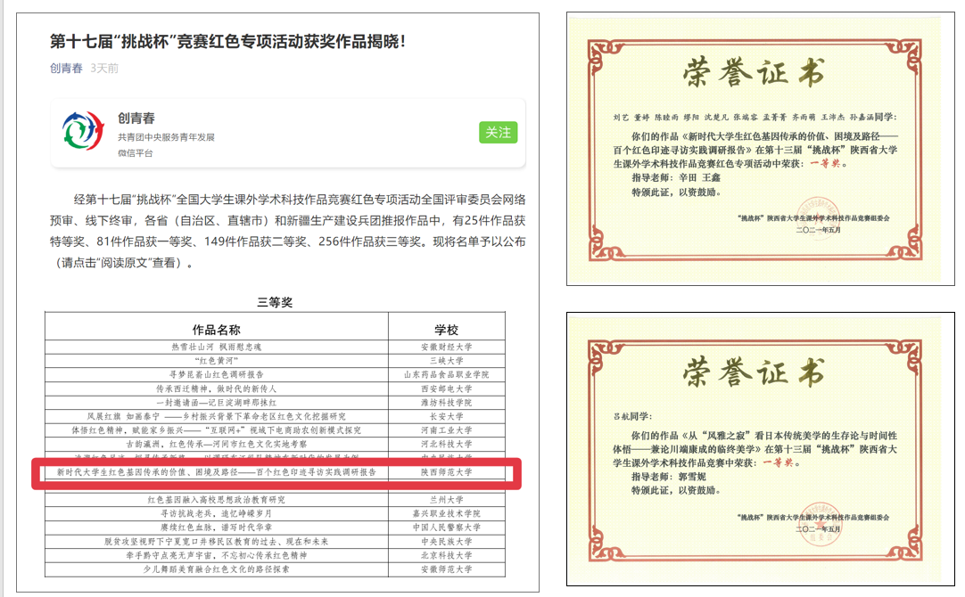 第十七届“挑战杯”全国老员工课外学术科技作品竞赛红色专项,全国共报送参赛作品11184件,公司报送的作品《新时代老员工红色基因传承的价值、困境及路径——百个红色印迹寻访实践调研报告》荣获全国三等奖、陕西省一等奖,是公司获红色专项全国奖项唯一作品。作品由辛田、王鑫指导,团队负责人为刘艺,团队成员包括王沛杰、陈睦雨、沈楚凡、缪阳、齐雨萌、孙嘉涵、孟菁菁、张端容、董婷。
