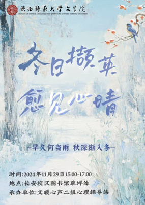 文暖心声二级心理辅导站文暖心声将组织“冬日撷英,愈见心晴”特别活动,用落叶记录动人的深情,以色彩渲染生活的画卷,借花瓣传递温暖的邀请,让心灵在这个充满轻语与共鸣、绚烂与寂静的季节里,寻得一份归属与释放。