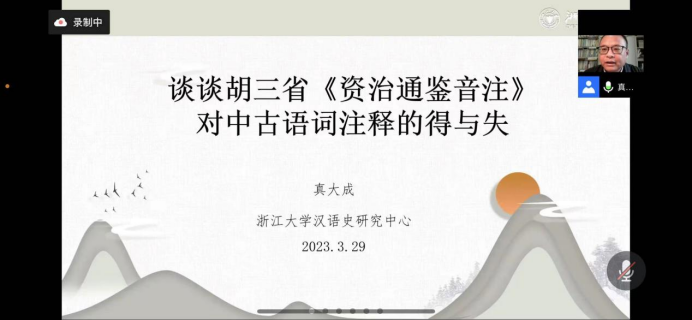 浙江大学真大成教授指出了胡三省《资治通鉴音注》对研治汉语史的重要性,通过举证史炤《释文》,向同学说明了胡三省《音注》之前的《通鉴》注的“浅陋粗疏”,继而引出胡三省对《通鉴》中古语词的注释,并以《晋纪》为例,指出胡注的优点。真教授也从“不明先秦两汉古义”“不明魏晋以来新义”等五个方面,通过大量实例说明胡三省《音注》中存在的不足。